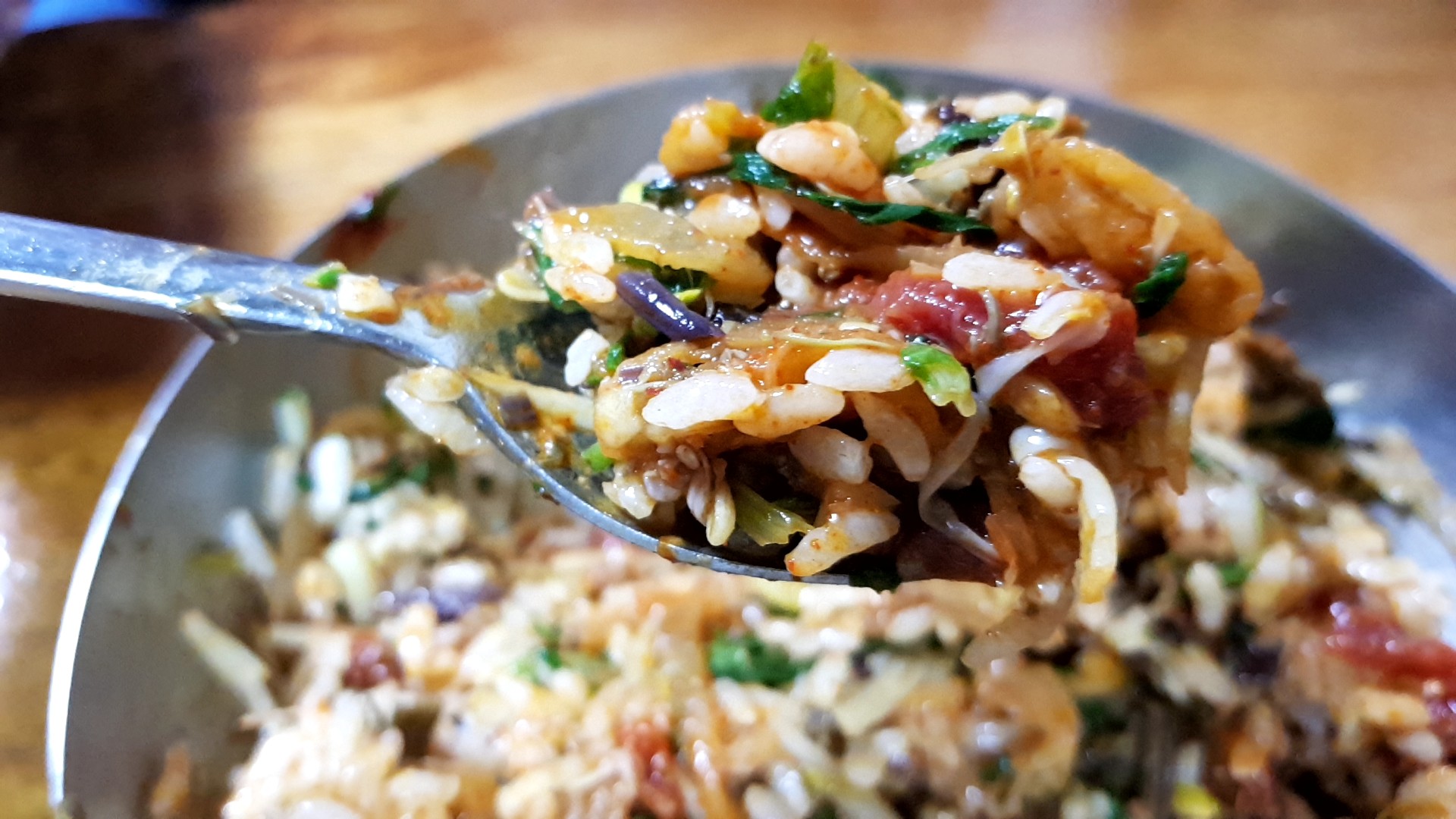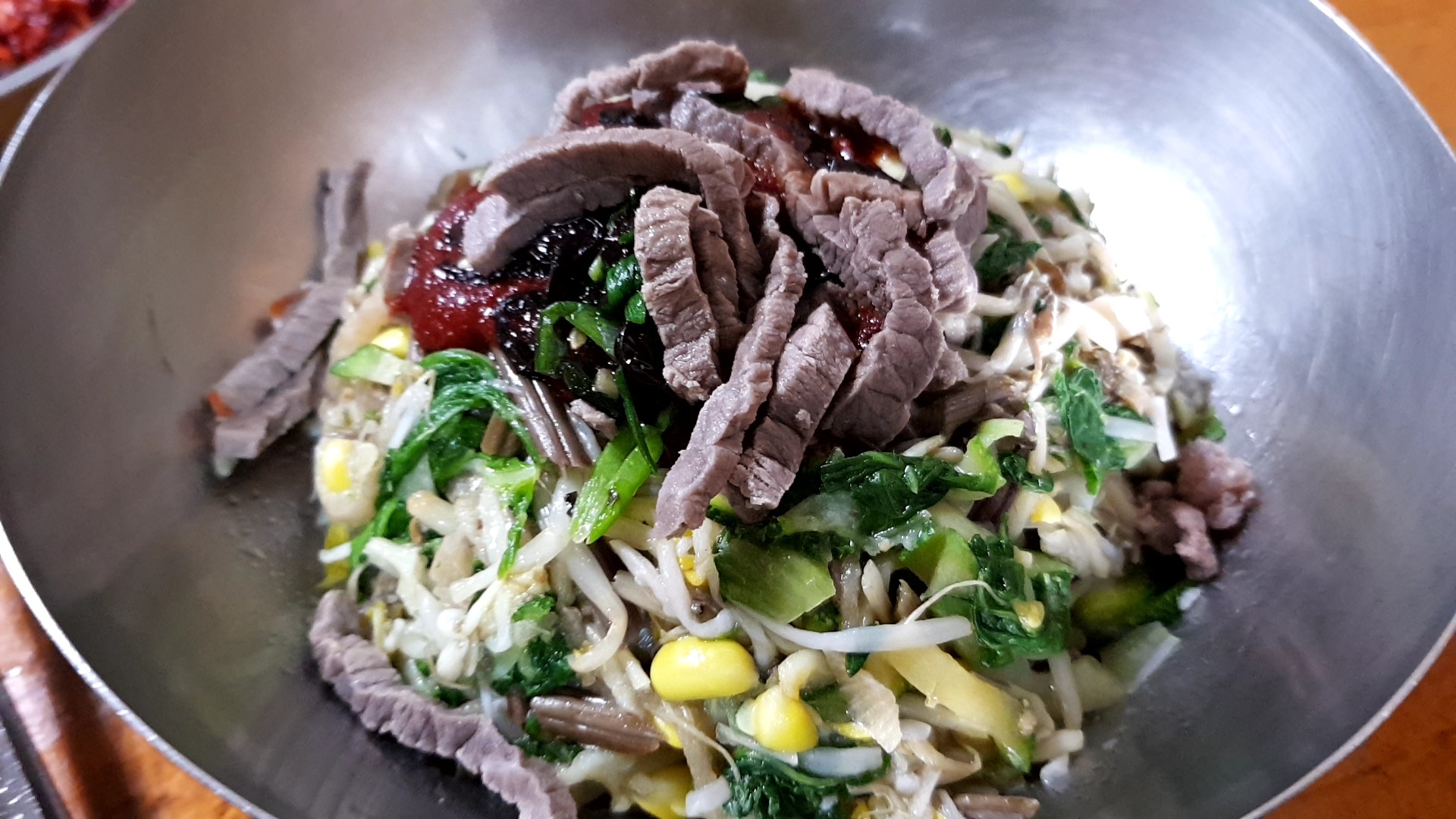 솔직히 전체적으로 맛있는데 어른들이 좋아할 맛이었습니다. 식감이 전체적으로 부드럽고 참기름이 많아 고소하면서 번들번들했습니다. 밥도 무침채소때문인지 물기가 있어 어른들이 좋아할 식감이라고 생각했습니다. 맛있는데 조금 시장 어른들이 먹기 좋게 만들었다고 느껴졌습니다.