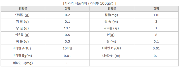 1. 영양학적으로 사과는 당분과 유기산 무기성분 아미노사 향기성분으로 나눌수 있습니다. 사과의 대부분은 수분이 함량되어 있고 평균 85% 정도입니다. 나무지 11~14%는 단맛성분인 당분이 들어있는데, 반 정도 과당이 차지하고 나머진 포도당과 설탕이 들어있습니다. 또한 신막 성분인 유기산 (사과산과 구연산), 무기성분으론 칼륨이 제일많고 칼슘, 인산, 나트륨, 철이 각각 들어있습니다. 그외 소량의 필수아미노산, 아스파라긴산, 아스파라긴도 있습니다. 비타민C 또한 풍부합니다.