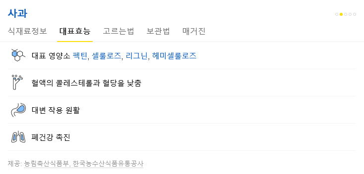 - 콜레스테롤조절 : 사과의 팩틴, 콜레스테롤 흡수 및 배설 촉진