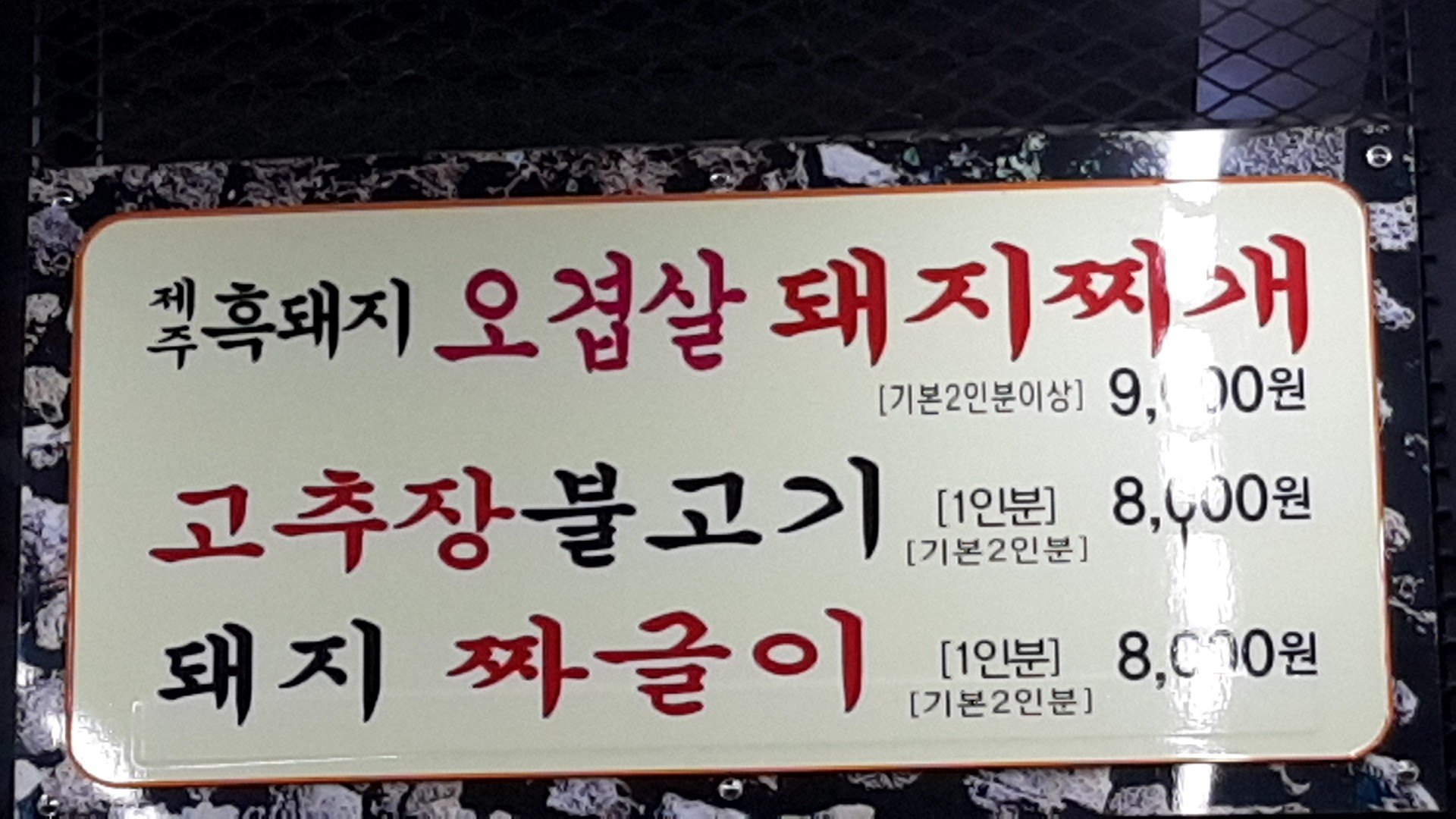 오겹살 돼지찌개는 1인분 9천원 고추장 불고기는 8천원이네요. 돼지짜글이도 맛있을듯합니다.
